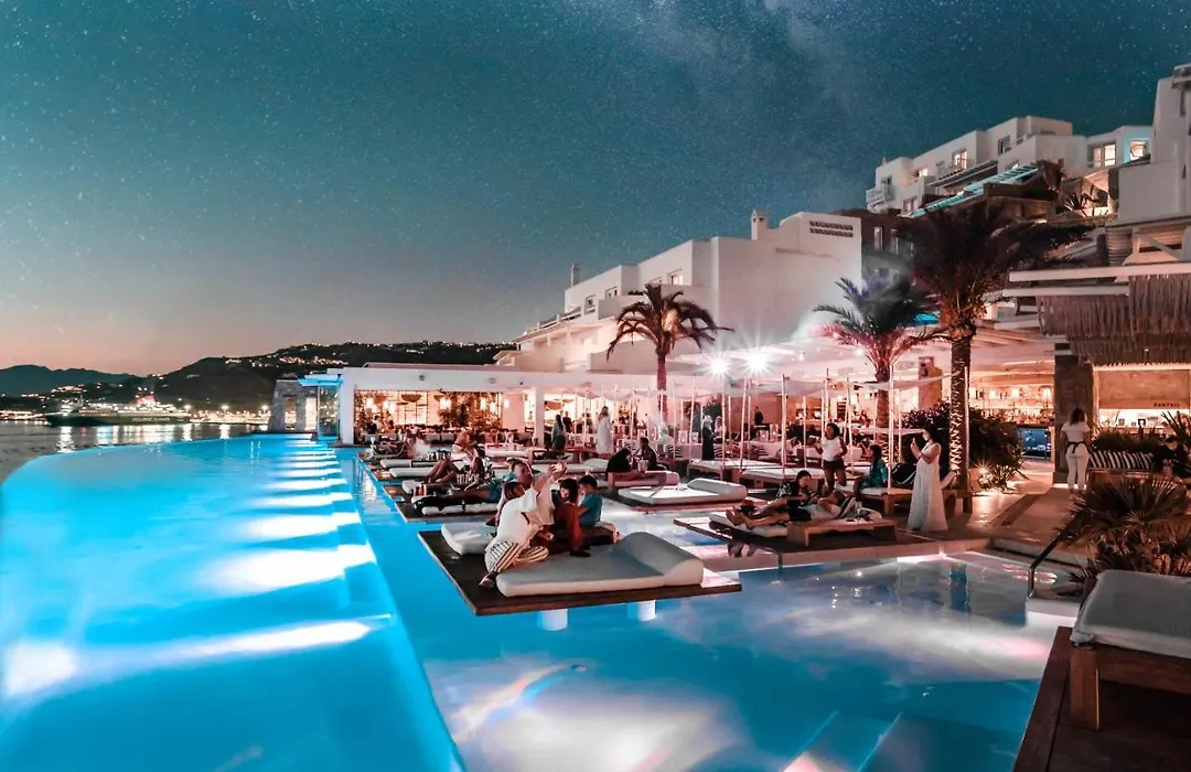 Cavo Tagoo Mykonos propose une piscine à débordement avec éclairage coloré et un spa équipé d'une piscine intérieure et de salles de soins. Des services de conciergerie assurent une expérience de séjour unique en répondant aux demandes des clients.