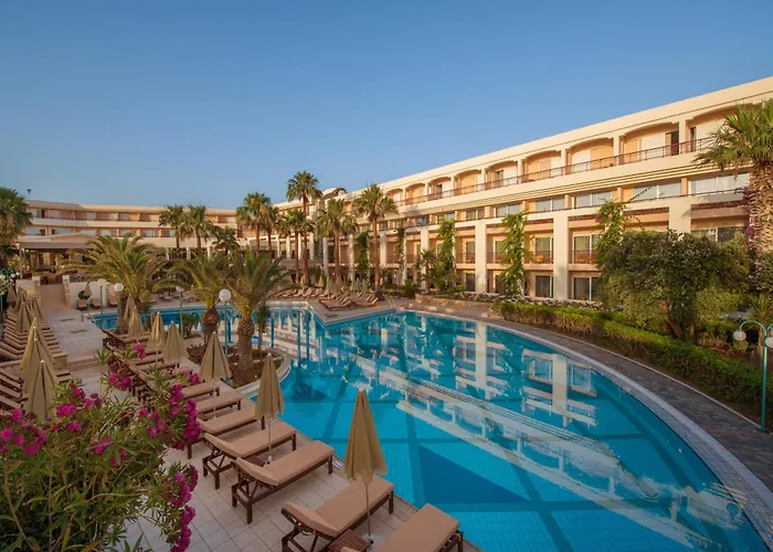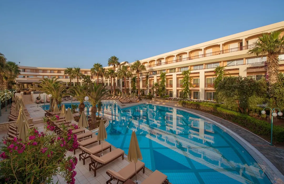Rethymno Palace, hôtel 5 étoiles avec un rating de 8.2/10 sur Booking.com, propose des chambres luxueuses et une piscine extérieure, offrant de nombreux services de bien-être et diverses options de restauration à proximité de la plage d'Adelianos Kampos.